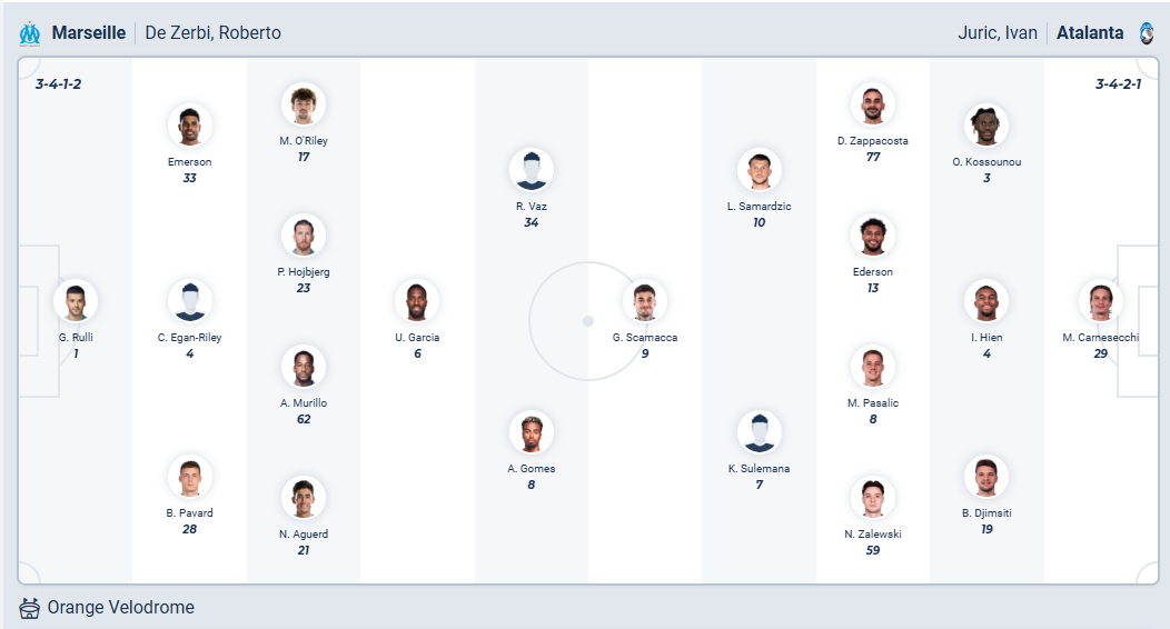 Atalanta lâu lắm rồi không thể thắng, 6 trận gần nhất họ hòa 5, thua 1 và đó là trận thua ở trận gần nhất của mình. Đội bóng của HLV Ivan Jurić đang không có thứ hạng tốt tại Serie A và cũng chỉ có 4 điểm sau 3 lượt đấu nên rất cần chiến thắng để chấm dứt chuỗi trận đáng thất vọng vừa qua. Tuy nhiên chuyến làm khách trên sân của đội bóng đang chơi tốt lên như Marseille không hề dễ dàng, nhiều khả năng Atalanta sẽ phải nhận thêm một trận thua nữa và chưa thể cải thiện phong độ của mình.